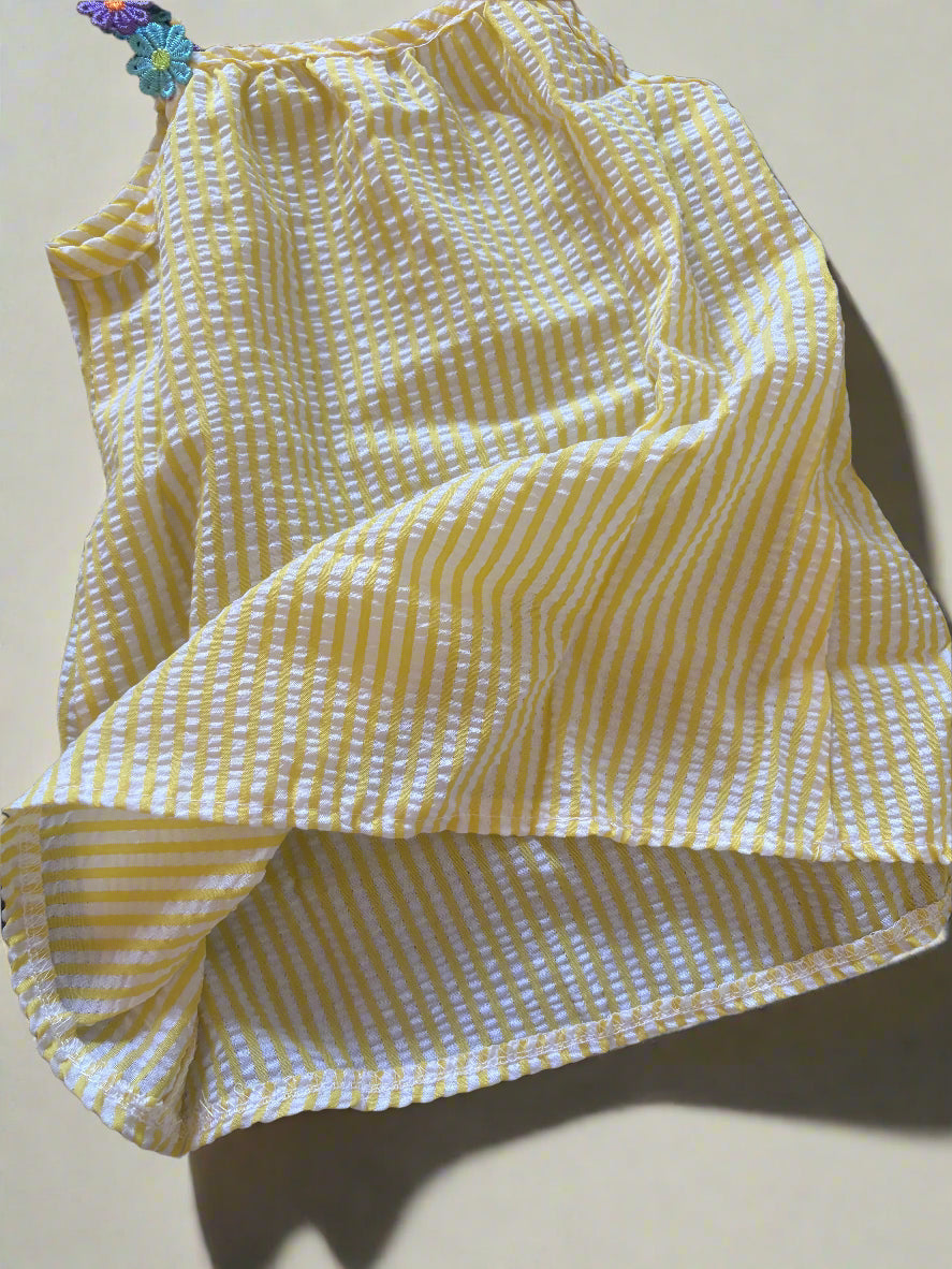 Our gorgeous summer dress features vibrant yellow stripes and is crafted from an ultra-lightweight fabric. Its colorful floral sleeves add a whimsical finishing touch.