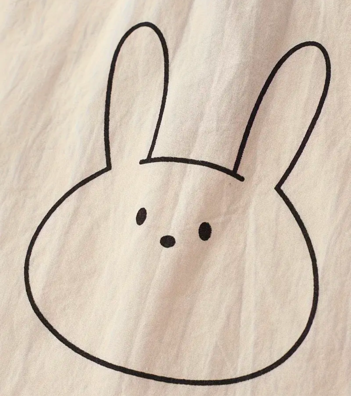 Quirky cartoon-inspired rabbit print two-piece set in a cool earthy beige. Made from pure cotton, it's super lightweight and comfy for your little one. Adorable oversized fit, with easy button detailing at the back.